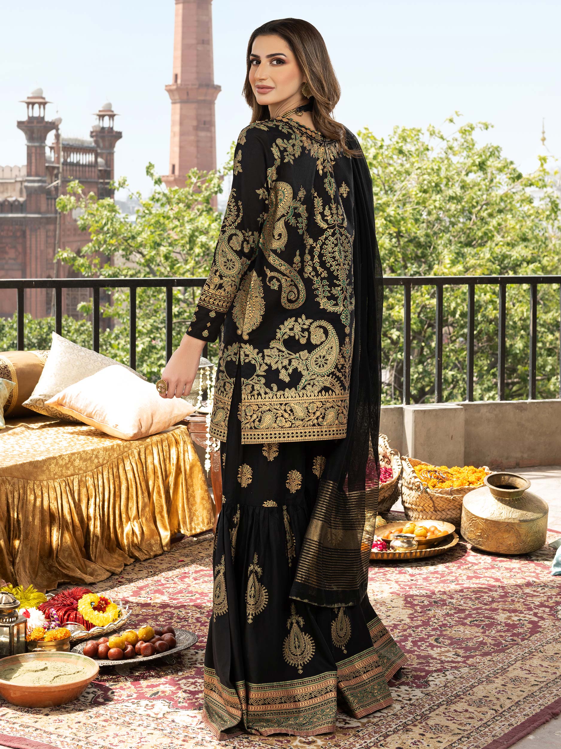 - Gold paste print wide-leg gharara with elasticized waistband